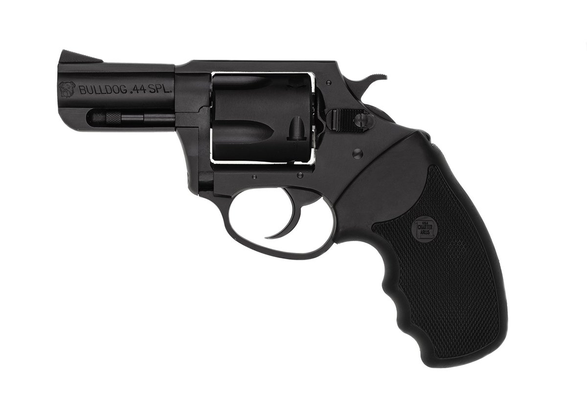 Bulldog is a powerful, but compact revolver. The Bulldog is ideal for concealed carry and target practice. Its ergonomic, finger-grooved rubber grip minimizes recoil for maximum comfort and control, while the potent .44 Special chambering delivers almost twice as much muzzle energy on target as the less powerful .38 Special.