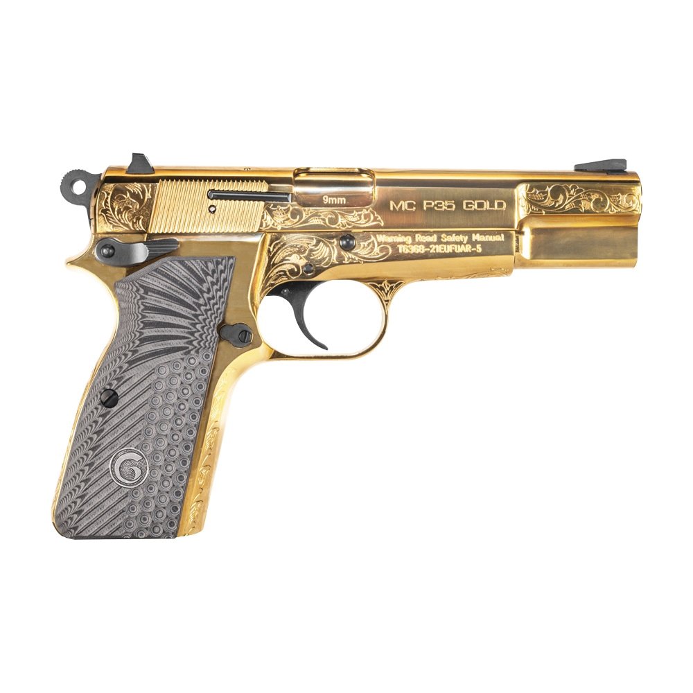 The Girsan Gold MC P35 high-power is a tribute to the legendary handgun designed by John Browning, crafted with meticulous attention to detail and respect for its timeless design. Built with a durable steel frame and slide, this remarkable firearm features a staggered column magazine that holds an impressive 15+1-rounds, offering both reliability and ample capacity. The gold-colored engraving, adorned with an elegant floral design, enhances the pistol's appearance, exuding a royal finish that is often seen in elite institutions. The Girsan Gold MC P35 high-power boasts G10 grips made of fiberglass-based epoxy, providing exceptional durability and water resistance. Its ambidextrous safety caters to both left and right-handed shooters, while the windage drift-adjustable rear sight allows for added flexibility and precise customization. A thoughtfully designed ring hammer reduces hammer bite, ensuring a more comfortable shooting experience by preventing hand injury. To complement its striking design, this exclusive model comes with a luxurious case that further enhances its aesthetic appeal, making it not just a firearm but a true work of art.