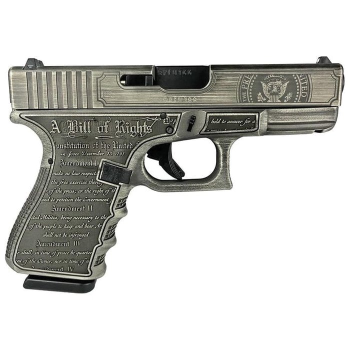 The Glock 19 Gen3 custom "Trump 2024" is a semi-automatic pistol designed for collectors and enthusiasts, combining the proven reliability of Glock with a unique commemorative design