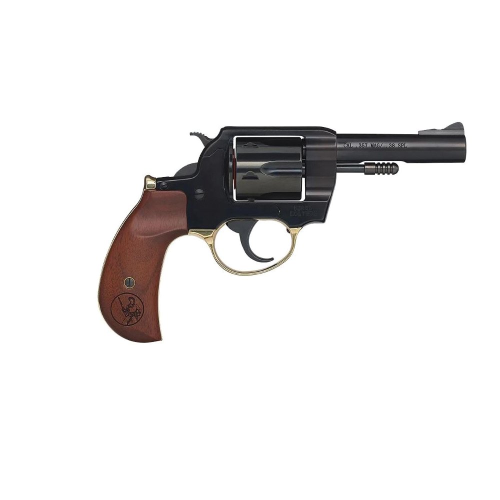 Introducing the Big Boy Revolver: a classic six-shooter designed to stand proudly alongside our renowned Big Boy rifle or shine on its own. Embodying Henry's commitment to meticulous American craftsmanship, this revolver borrows styling cues from its rifle counterparts. Crafted from highly polished blued steel, the medium-sized frame, quick-release cylinder and 4 inches barrel exude quality. Genuine American walnut grip panels complement a mirror-like brass trigger guard that spans from the grip to the back strap. Weighing approximately 34 oz, it balances ease of carry with a soft shooting experience, featuring smooth double action pulls and crisp single action breaks. For accuracy, a traditional revolver sight picture is ensured by a fixed notch cut into the frame and a ramped blade front sight, offering three sizes for precise point of aim adjustment. Safety is paramount with a transfer bar mechanism, preventing the firing pin from engaging unless the hammer is cocked back and the trigger squeezed. The Big Boy Revolver is versatile with the ability to handle robust .357 Magnum hunting loads or lighter .38 Special target rounds with equal ease. Sharing ammunition compatibility with its rifle counterpart adds practicality for both recreational shooting and practical use in the field , a hallmark of Cowboy Logistics. For collectors and enthusiasts alike, the addition of the Big Boy Revolver represents a significant milestone, combining modern design features with timeless style true to the Henry legacy.