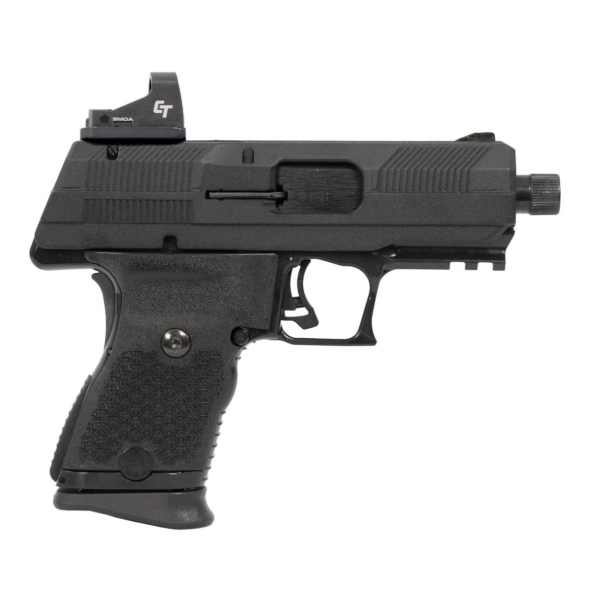 Introducing the Hi-Point YC9RDCT, the latest iteration of the YC9 series. Chambered in 9mm and +P rated, this pistol includes a standard 10-round magazine and features a 4.12 inches threaded barrel (1/2-28). The YC9RDCT incorporates upgraded grip texturing for enhanced ergonomics, along with front and rear slide serrations for easy press checks. Enhancements continue with an upgraded trigger and the addition of a 1913 picatinny rail, allowing customization with lights or lasers of your choice. Notably, this model comes equipped with a Crimson Trace red-dot sight mounted on top for improved aiming precision. The front sight is compatible with standard Glock Front Sights, providing versatility in sighting options. Known for their durability and affordability, Hi-Point maintains its reputation with the YC9RDCT, offering robust performance at a competitive price point. This pistol represents Hi-Point's commitment to delivering quality firearms that meet the demands of shooters seeking reliable functionality and modern features.