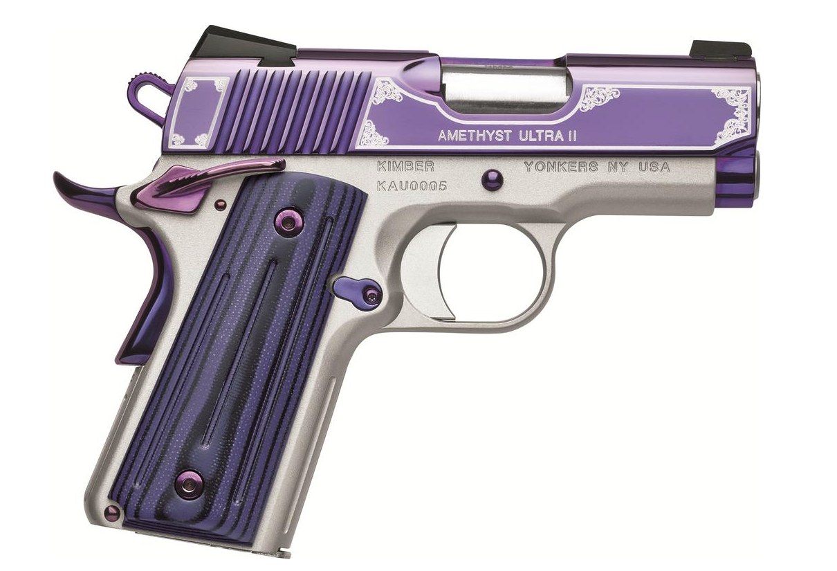 The Amethyst Ultra II is a striking personal defense pistol that combines dynamic style with a host of performance-enhancing features. This Kimber Special Edition Amethyst Ultra II is a great compact 1911 in .45 ACP. It offers all of the American manufacturing, accuracy and reliability that you have come to love from Kimber. This special edition Ultra from Kimber features amethyst purple slide and small parts, match grade aluminum trigger factory set at 4-5 pounds and tactical night sights. Kimber has gained a solid reputation for manufacturing highly accurate 1911-style pistols, offered with a wide range of custom features direct from the factory. The Ultra Carry II is designed for concealed carry/personal defense with performance-enhancing features to get you on target quickly. An aluminum frame keeps weight down to a minimum and resists corrosion from carrying the pistol close to the body. The frame and the steel slide have a matte black finish to further minimize corrosion and prevent unwanted reflection in low light environments. An aluminum match-grade trigger is factory set to break clean and crisp for precise shot placement and enhance control during rapid fire.