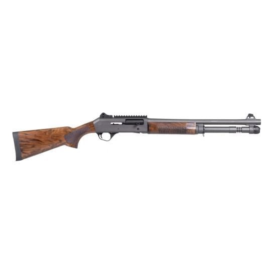 This phenomenal M4 semi-automatic shotgun is quickly becoming legendary for rugged reliability you can count on in the most adverse circumstances and conditions. The M4 Tactical shotgun is light, durable, fast-handling, and an exact copy of the well-respected brand name with the famous A.R.G.O Piston-driven semi-auto action. This action is one of the best ever developed and cycles everything from target loads to the heaviest 3-inch magnums. Also featured on this model is an extended mag tube with sling attachment points. A rail section runs along the top of the receiver and is perfect for optics mounting. If you do not wish to mount an optic, ghost ring sights come standard. The robust tactical design and legendary reliability of the action make this a must-have shotgun. This particular model comes with a really unique and strikingly handsome Walnut Wood Butt Stock w/ Hand Guard.