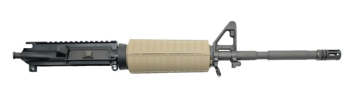 Barrel: 4150V Chrom Moly steel nitride coated barrel. Chambered in 5.56 NATO, with a 1/7" twist, M4 barrel extension, and a carbine-length gas system. This M4 profile barrel is finished off with a standard handguard in Flat Dark Earth, an F-Marked gas sight base, and an A2 flash hider.