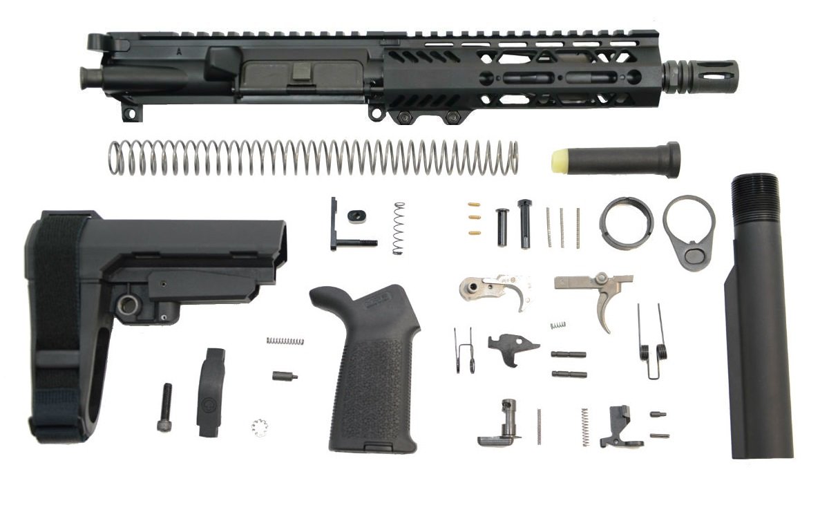 Build Kit: A high quality lower build kit with everything you need to assemble your AR-15 lower into a pistol. Features Enhanced Polished Trigger (EPT), Magpul Grip, Magpul Trigger Guard, and black oxide coated hammer and trigger springs. Also includes SB Tactical SBA3 Adjustable Pistol Brace, castle nut, latch plate, carbine buffer spring, 5 positioning mil-spec buffer tube, and standard carbine buffer.