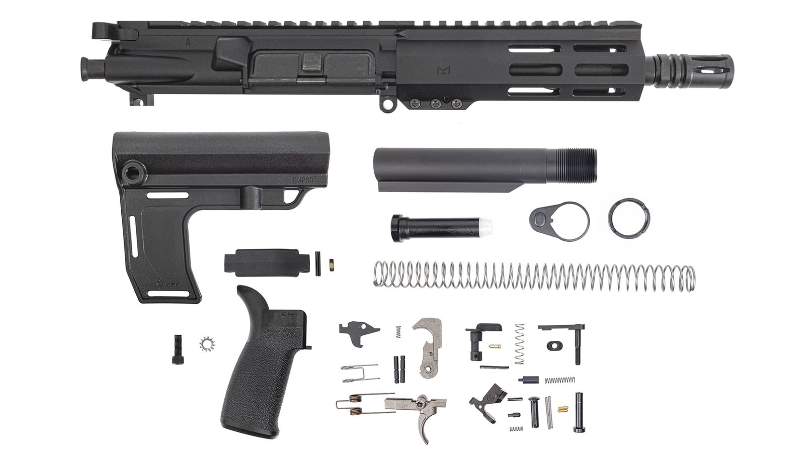 Lower Build Kit: PSA MFT Battlelink EPT Pistol Lower Build Kit with Mission First Tactical Battlink Pistol Stabilizer with dual-sided QD points, Mission First Tactical Engage V2 Pistol Grip, Mission First Tactical Enhanced Trigger Guard, 5 positioning mil-spec buffer tube, carbine latch plate, and PSA Enhanced Polished Trigger Group (EPT) fire control group.