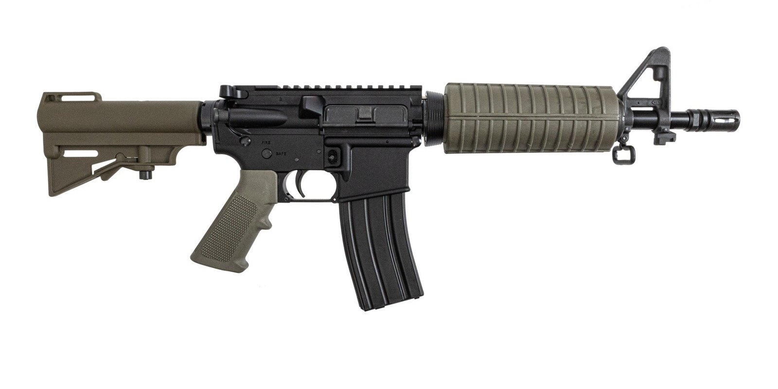 Barrel: 10.5" Chrome Moly steel Nitride coated barrel. Chambered in 5.56 NATO, with a 1/7 twist, M4 barrel extension, and a carbine-length gas system. The barrel is finished off with a classic handguard, .750 F-Marked gas sight base, and A2 flash hider.