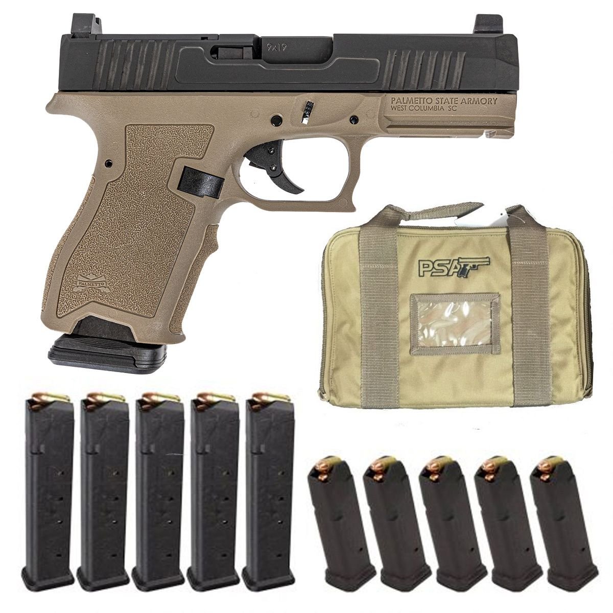 PSA Dagger Compact 9mm Pistol With Extreme Carry Cut Doctor Slide & Non-Threaded Barrel, Black With 5-27RD and 5-15 Rd Mags, FDE Frame