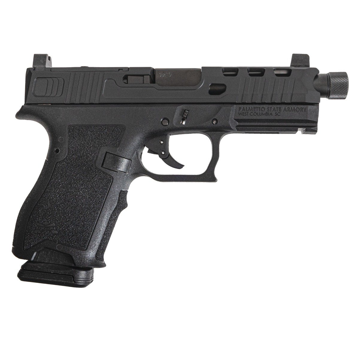 A compact-sized polymer-framed pistol, the Palmetto Dagger with Carry Cuts(TM) introduces game-changing ergonomics and controllability. Made from high-quality stainless steel and advanced polymers, this pistol lives up to today's highest expectations while maintaining the unmatched Palmetto State Armory value. Chambered in 9x19mm, the Palmetto Dagger is fed from a supplied PMAGA(R) 15 GL9(TM) (15-Round) magazine and operated by a smooth single-action striker-fired trigger mechanism. The Palmetto Dagger is feature-rich even in its standard form, yet also provides a framework for further customization, as it is highly compatible with many aftermarket offerings. The new Carry Cuts(TM) offer smoother edges to the rear and front of the slide to help with faster drawing without snagging the user's holster. The slide is also finished with a Black Cerakote coating. The PSA Dagger SWRV2 Slide features milled windows on the top corners of the slide, as well as a gator mouth-like concave cut to the front of the slide to create an enhanced look and feel, to the already distinguished design of the PSA Dagger, while also reducing the overall weight of your pistol. Additional Features: Ergonomic Grip Shape SWRV2 Window Cuts on Slide Extreme Carry Cuts(TM) on Slide Aggressive Grip Texturing Striker Fired Flat Faced Trigger Striker Block Safety and Trigger Safety Co-Witness Sight, Black Serrated (Not a Night Sight) Stainless Steel Recoil Spring Guide Rod Black Cerakote Slide 4.9" 1:10 Twist Black DLC Coated Threaded Stainless Steel Barrel Polymer Frame, Black 15rd Magazine (1) PSA Dagger Soft Pistol Case