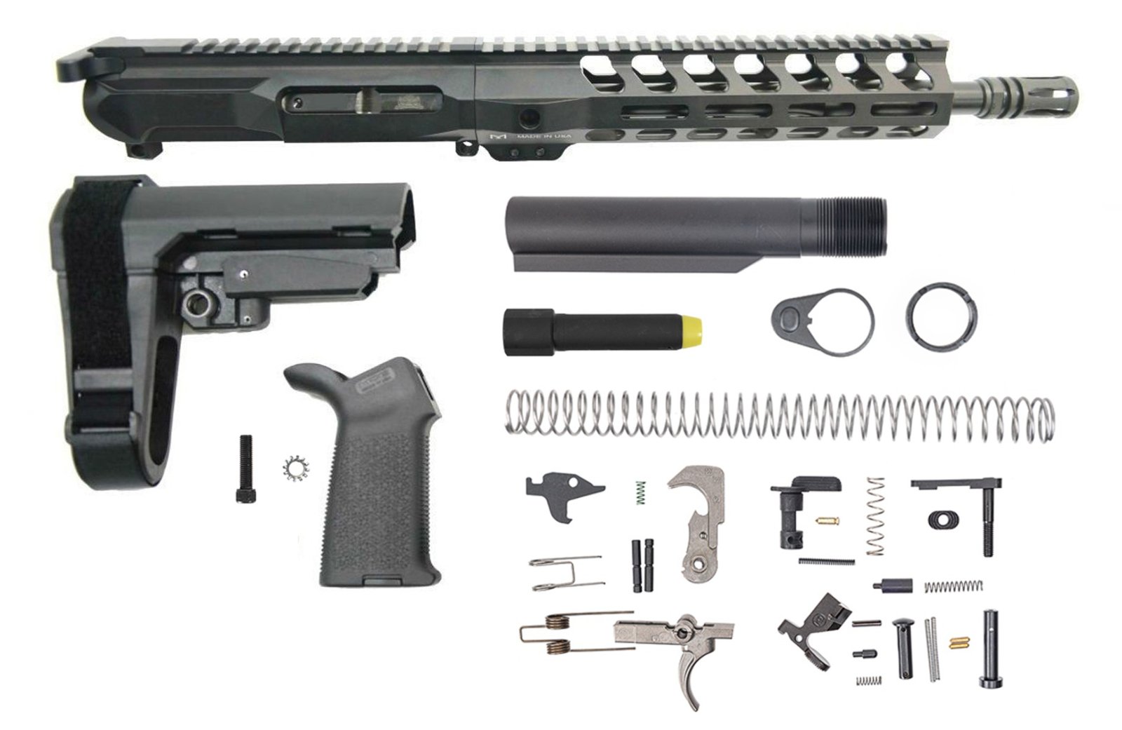 Build Kit: A high quality lower build kit with everything you need to assemble your AR-9 lower into a pistol. Features an Enhanced Polished Trigger (EPT), Magpul Grip, Magpul Trigger Guard, and black oxide coated hammer and trigger springs. Also includes SB Tactical SBA3 Adjustable Pistol Brace, castle nut, latch plate, carbine buffer spring, 5 positioning mil-spec buffer tube, and 9mm buffer.*PSA Can't Guarantee Function With EndoMag 9mm Magazines