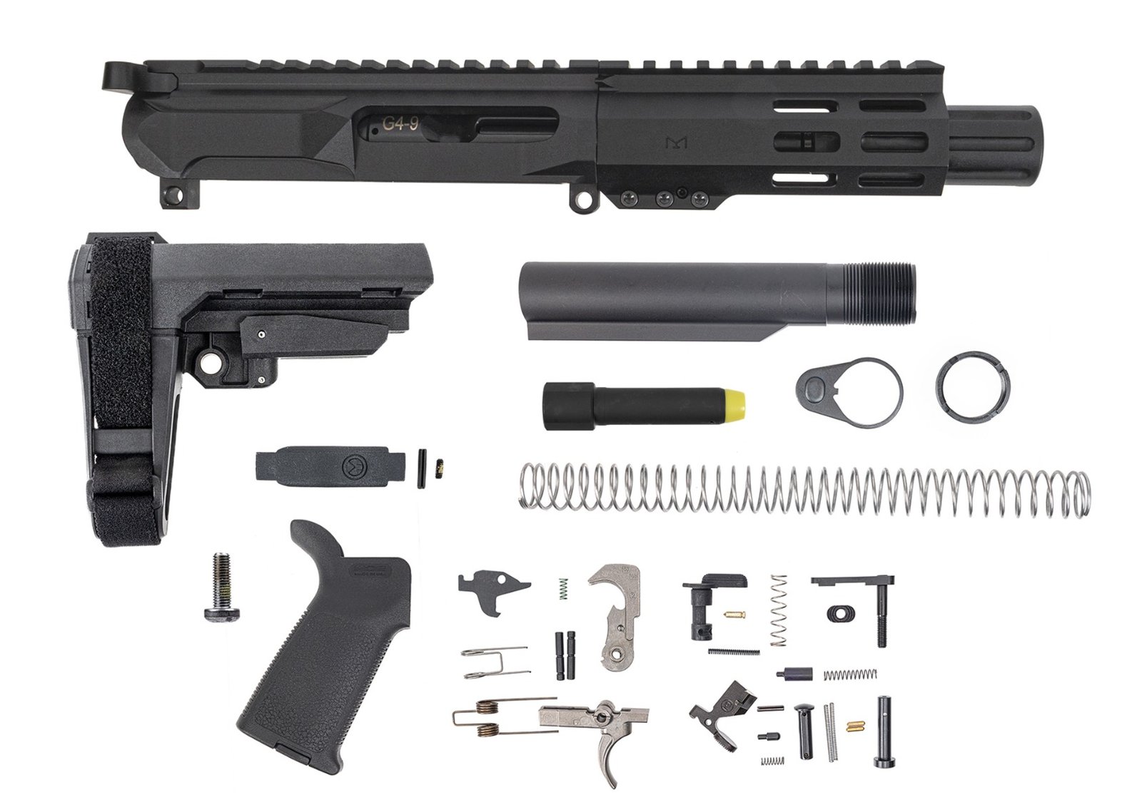 Build Kit: A high quality lower build kit with everything you need to assemble your AR-9 lower into a pistol. Features an Enhanced Polished Trigger (EPT), Magpul Grip, and black oxide coated hammer and trigger springs. Also includes SB Tactical SBA3 Adjustable Pistol Brace, castle nut, latch plate, carbine buffer spring, 5 positioning mil-spec buffer tube, and 9mm buffer.