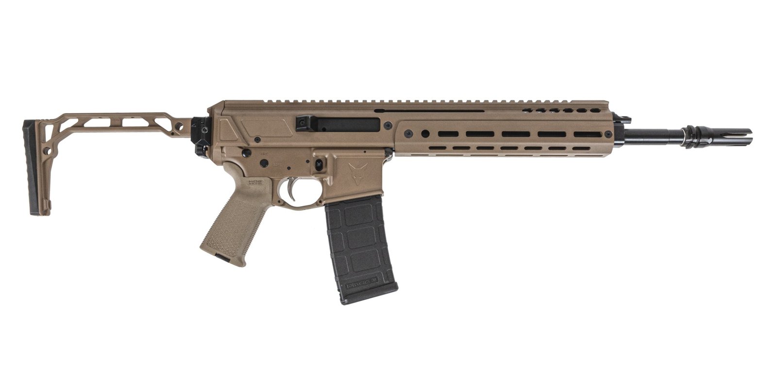 Palmetto State Armory is proud to announce the long-awaited release of the JAKL Rifle chambered in 5.56 NATO! This platform is built around a 6105 monolithic upper receiver designed to be compatible with any Mil-Spec AR-15 lower receiver. The PSA JAKL offers a buffer system that is fully captured in the upper receiver, shortening the overall length of the firearm. Completed with a Pin & Weld JMAC Customs GFHCE-28-S-KM Muzzle Device Pin & Weld, JMAC Customs Skeleton 8" Stock with Integrated Rubber Butt Pad, which allows for a side-folding Stock, and PSA Enhanced Polished Trigger fire control group. Jakl finished in a Flat Dark Earth Cerakote Coating.