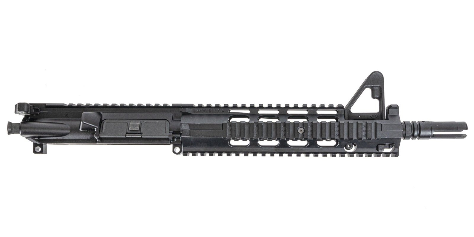 Barrel: 10.5" barrel chambered in 5.56 NATO, 1:7 twist, M4 barrel extension, and a carbine-length gas system. Barrel is finished off with a PSA 10" Two-Peice Quad Rail, and a Sabre Compensator.