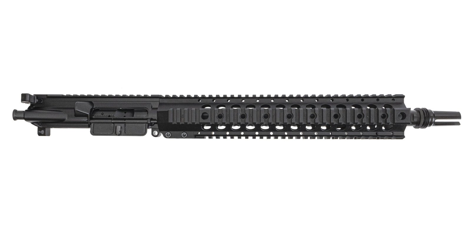 Barrel: 13.7" barrel chambered in 5.56 NATO, 1:7 twist, M4 barrel extension, and a mid-length gas system. Barrel is finished off with a PSA 13" Quad Rail, and a SilencerCo ASR Extended Pin and weld muzzle device.