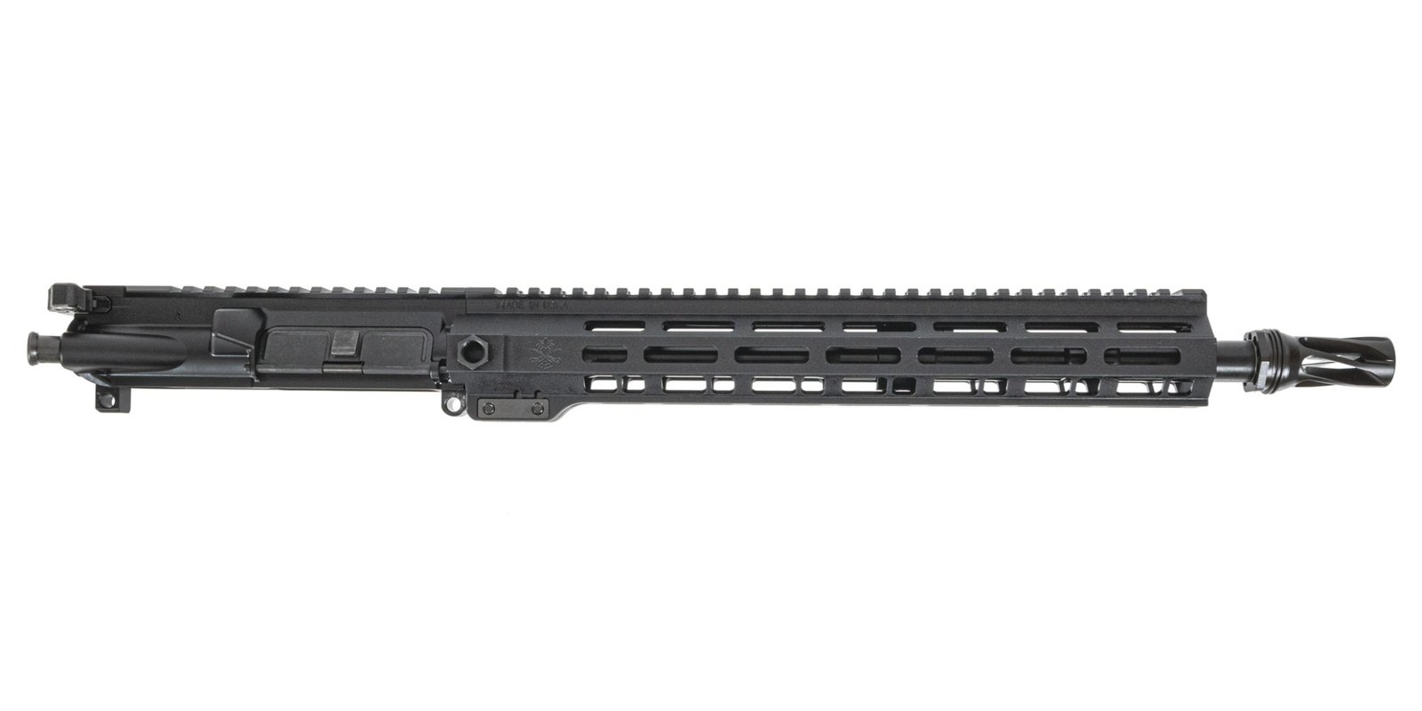 Barrel: 14.5" 4150V Nitride. Chambered in .223 Wylde, 1:8 twist, M4 barrel extension, and a Carbine-length gas system. Barrel is finished off with a 13" PSA Sabre QD Rail Handguard, and an Huxwrx QD Flash Hider Pin and Weld.