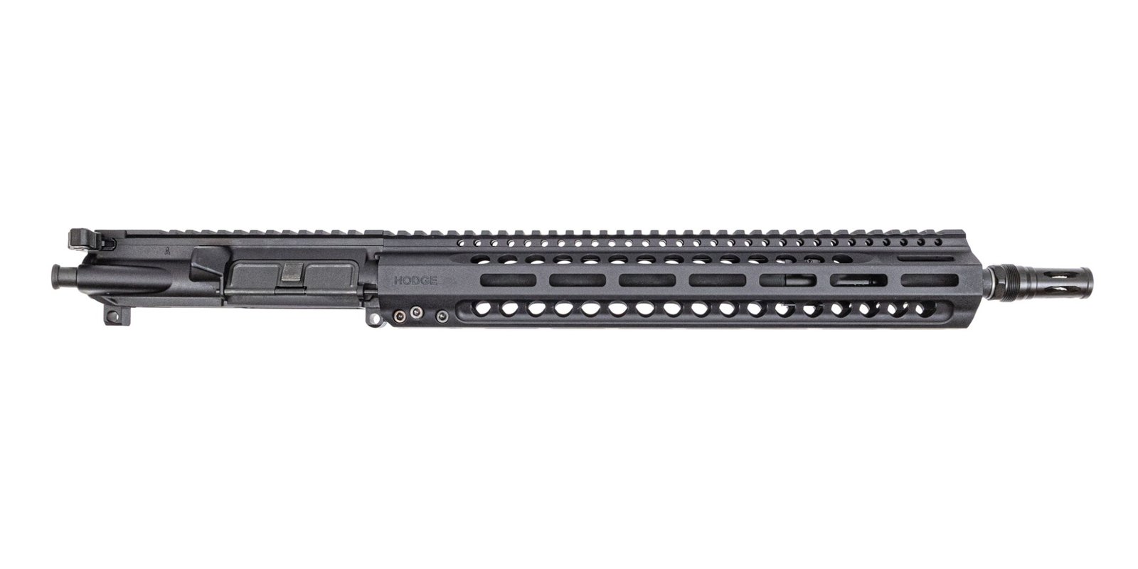 Barrel: 14.5" barrel chambered in 5.56 NATO, 1:7 twist, M4 barrel extension, and a mid-length gas system. Barrel is finished off with a 13.65" Hodge Defense P-Lock rail, and a Rearden MFG R2 pin and weld muzzle device.