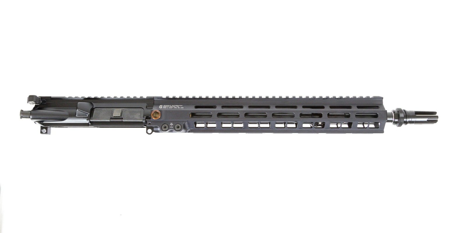 Barrel: 14.5" barrel chambered in 5.56 NATO, 1:7 twist, M4 barrel extension, and a mid-length gas system. Barrel is finished off with a GEISSELE 13.5" SUPER MODULAR RAIL MK8 M-LOK, and a SilencerCo ASR pin and weld muzzle device.