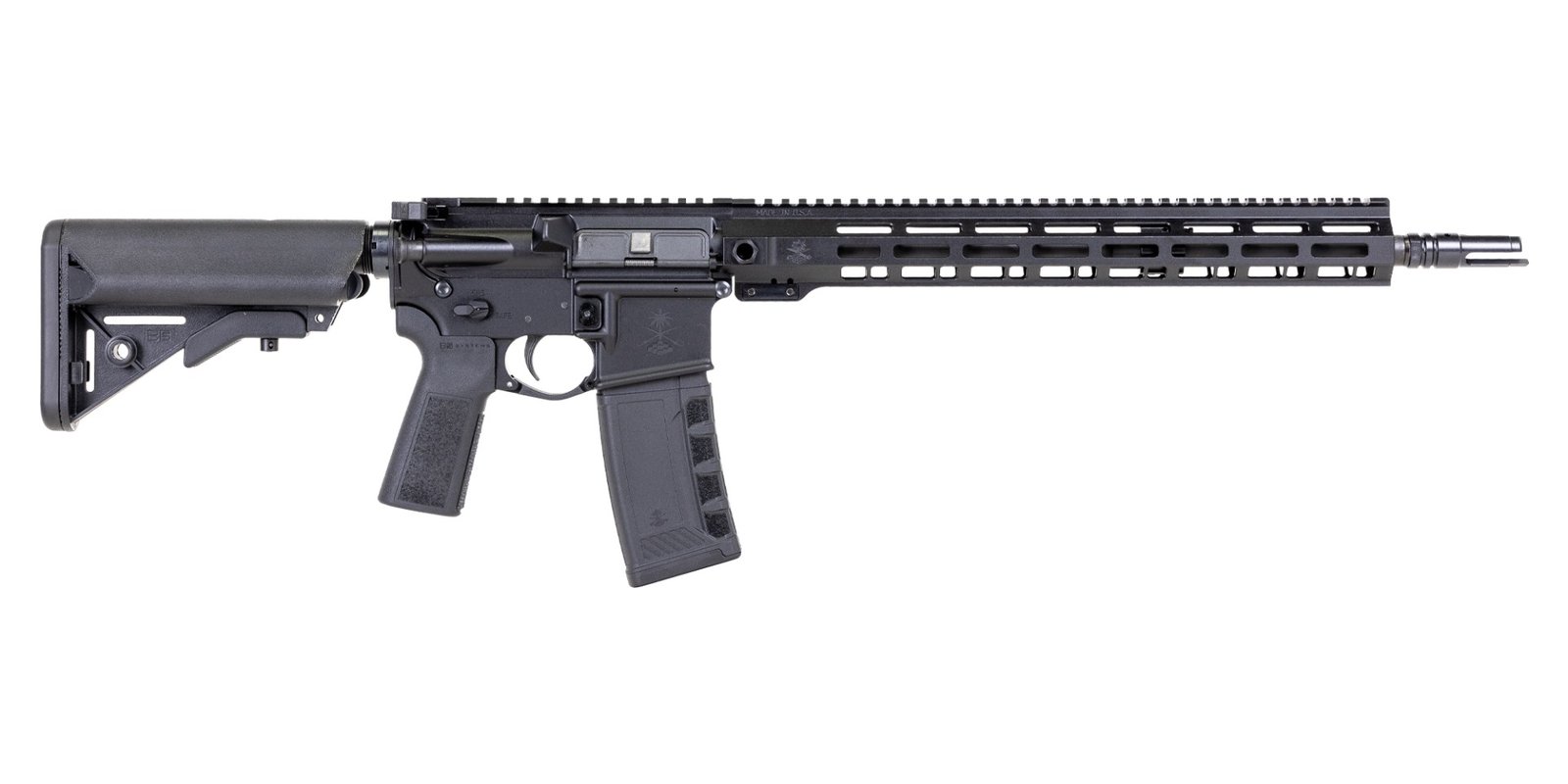 Barrel: 16" barrel chambered in 5.56 NATO, 1:7 twist, M4 barrel extension, and a mid-length gas system. Barrel is finished off with a PSA 15" Sabre QD Rail, and a Sabre compensator.