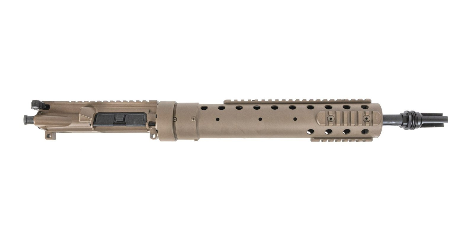 Barrel: 14.5" barrel chambered in 5.56 NATO, 1:7 twist, M4 barrel extension, and a mid-length gas system. Barrel is finished off with a 13" PRI Gen 3 FDE Tube, and a SilencerCo pin and weld muzzle device.