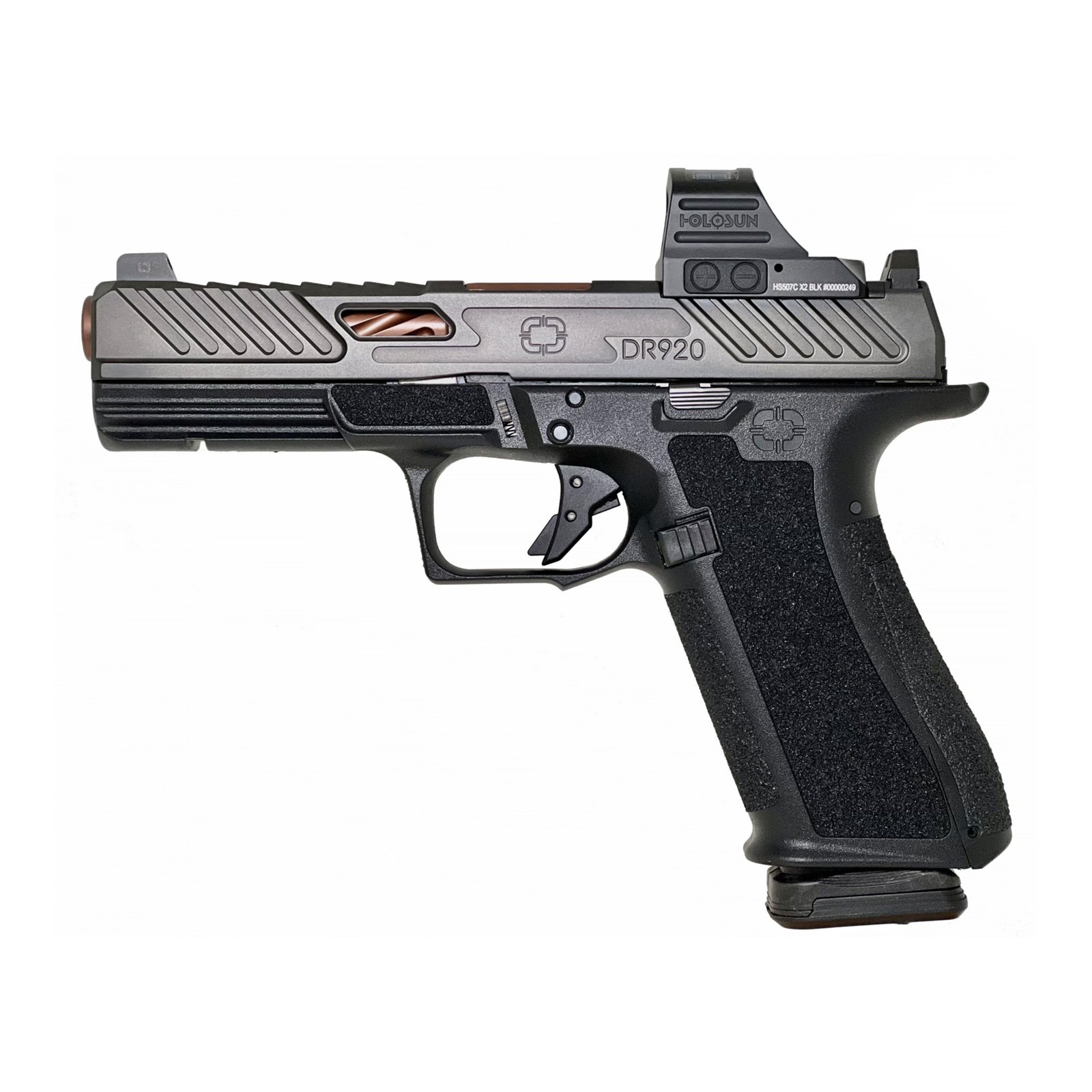 The MR920 is a feature-packed, compact-sized pistol that is designed to work with existing Glock 19 holsters, magazines, and gear. The match-grade barrel is conventionally rifled and spiral-fluted to improve evacuation of debris. MR920s are also available with threaded barrels. The drop-safe, flat-faced aluminum trigger has a 4.5-5.0 lbs trigger pull and a crisp, tactile reset. Optic cut models allow shooters to mount the mini red dot optic of their choosing. This pistol comes with a factory mounted Holosun 507C.