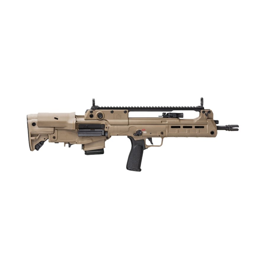 Introducing the low-capacity Hellion, adorned with a striking desert flat dark earth finish, this 5.56x45mm semi-automatic rifle redefines versatility. Its innovative bullpup design cleverly places the action behind the trigger, achieving a remarkably compact 28.25 inches length while preserving the efficiency of its 16 inches barrel. With ambidextrous controls and a reversible case ejection system, the Hellion seamlessly marries portability with potent performance. Designed to meet regulatory requirements, it ships with a 10 round magazine for customers in restricted states, ensuring compliance without compromising on capability. Experience the epitome of adaptability and performance with the low-capacity Hellion.