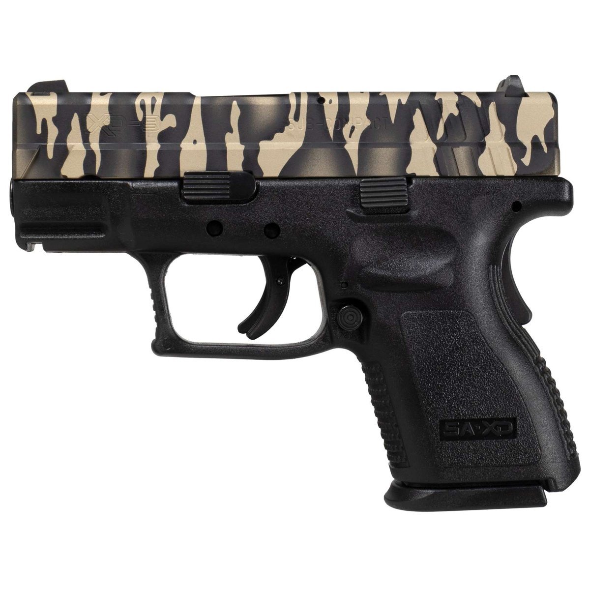 The XD set the bar for polymer pistols. In 2001, Springfield Armory redefined the industry standard for superior ergonomic comfort, ease of operation, features and performance in one fell swoop with the XD The grip safety, Ultra Safety Assurance (USA) Action Trigger System, and the firing pin block safety combine to make this an undeniably safe defensive tool. This model has a custom Tiger Stripe Camo Cerakote by Shark Coast.