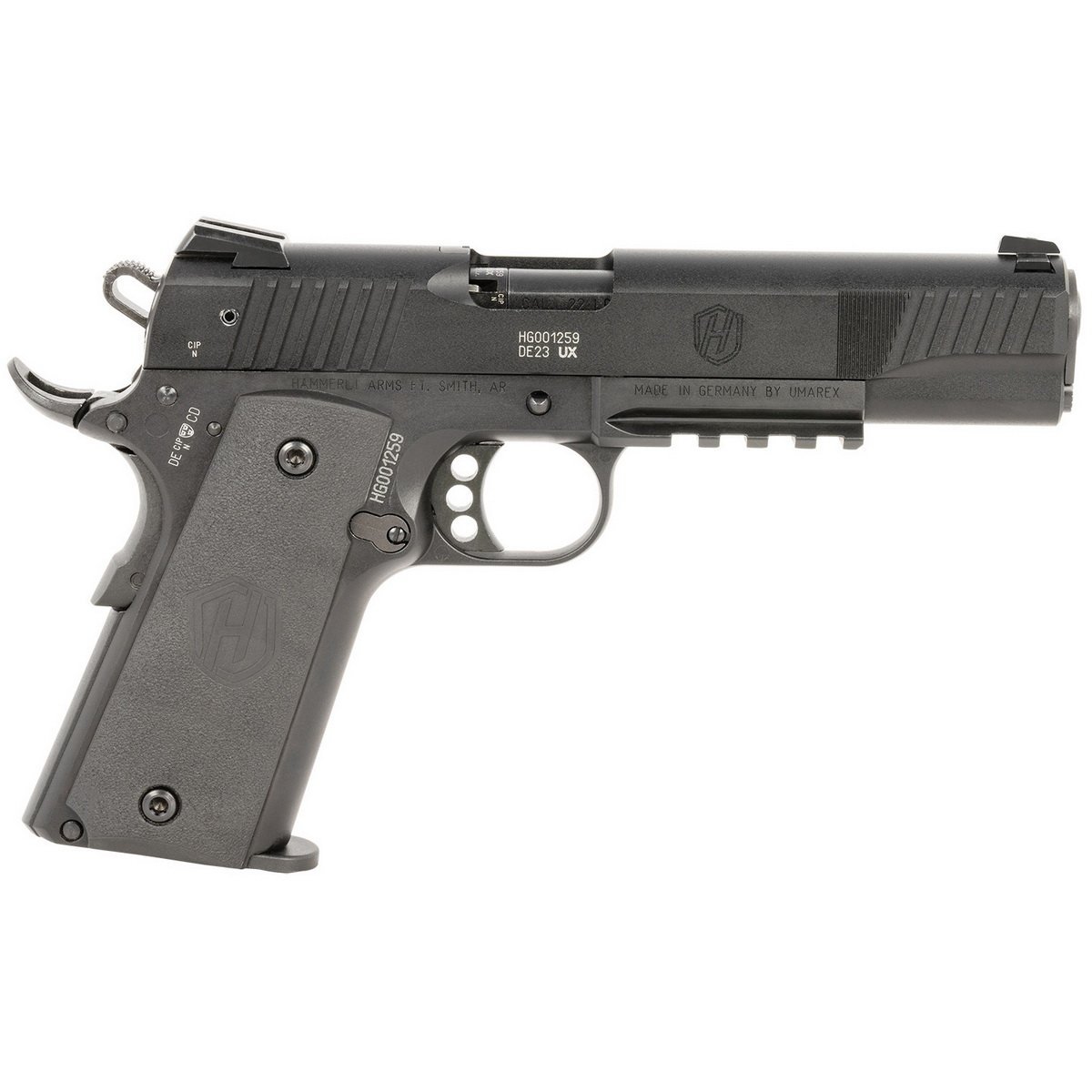 The Hammerli Forge H1 boasts a precise single action mechanism, delivering a smooth and responsive trigger pull. Designed for quick target acquisition, it features combat-style fixed sights. With a generous capacity of 12+1 rounds and two 12-round magazines included, it's an ideal choice for both target shooting and training. Safety is paramount with the extended thumb safety and beavertail grip safety, ensuring secure handling. The pistol also includes an accessory rail for mounting lights, lasers or other enhancements, while its commander-style hammer enhances both aesthetics and functionality.